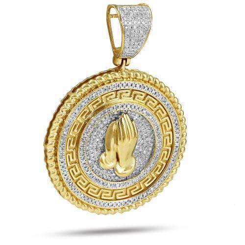 10KY 0.76CTW DIAMOND GREEK KEY PRAYING HANDS MEDAL