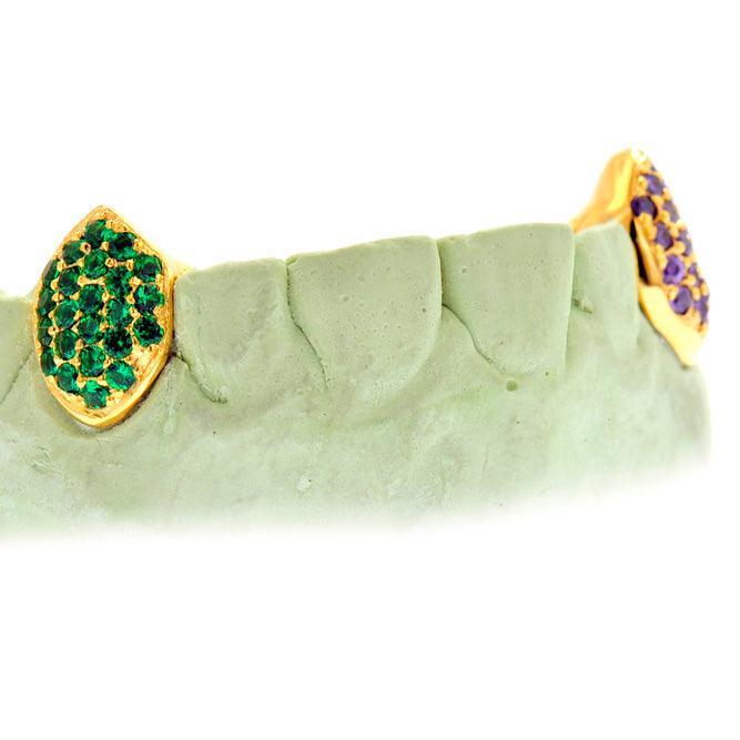 The price being displayed is for a 2 fang teeth grill in 10k yellow gold with natural green and purple grmstones as shown in the picture.  When placing your order, please inform us of any customization or upgrade request.  We will contact you to discuss the pricing and confirm your order.