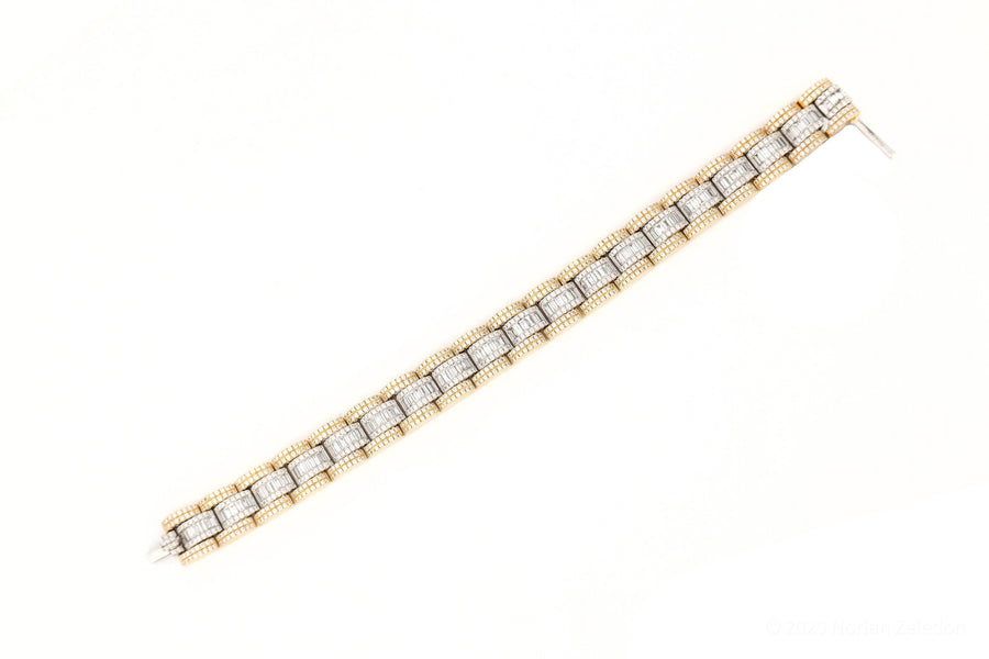 Luxurious two-tone baguette set diamonds bracelet crafted in 14kt white / rose gold encrusted in pave set diamonds.