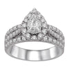 Fashioned In 14K White Gold, This Three Row Shank Engagement Ring Feature Pear Shape Solitaire Which Gives Perceived Look And Frame Of Smaller Round Accent Diamonds Surrounds This Center. Additional Round Diamonds Of Line The Ring's Shank, total diamond weight 1 1/2 ctw.